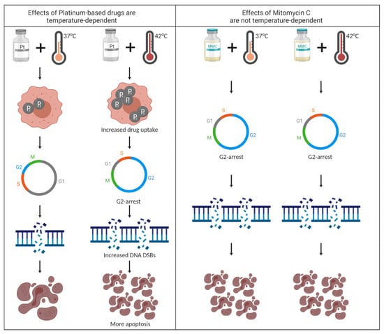Graphical conclusion. (A) Platinum-based drugs require hyperthermia to induce significantly more DNA double strand breaks (DSBs), G2 cell cycle arrest, and increased apoptosis in colorectal cancer cells. (B) MMC treatment, even without hyperthermia, induces DNA DSBs, results in G2-arrest and leads to high apoptotic levels in colorectal cancer cells. Created with Biorender.com.