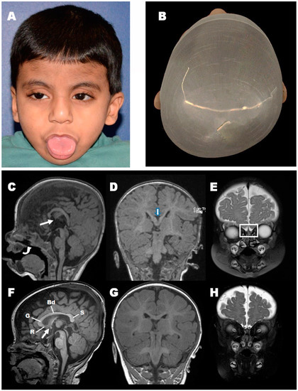 Reported case clinical presentation and Magnetic Resonance Imaging findings. Facial photos of the presented patient at 45 months of age. (A) Note the congenital blepharoptosis, tongue thrust posture, mild left ear constriction, mild frontal hirsutism. (B) Plagiocephalic head shape. (Note: The key clinical finding of cleft palate is not visible in these images). (C) Brain MRI showing midline sagittal T1 weighted image demonstrates a dysplastic corpus callosum with an atypical configuration showing focal thinning at the genu of the corpus callosum and an elongated vertically oriented splenium of the corpus callosum. The anterior commissure is hypoplastic (thin arrow). Cleft Palate is also noted (curved arrow). (D) Coronal T1 weighted image shows a cleft at the level of the splenium (thick arrow) denoting partial agenesis. (E) Coronal T2 weighted image shows the absence of the olfactory bulbs (Rectangle). (F–H) Similar views of an age match control show the normal configuration of the corpus callosum, which is divided into four parts: Rostum (R), genu (G), Body (Bd), and Splenium (S) as well as the anterior commissure (thin arrow). Note the olfactory bulbs on the coronal T2 weighted image (F).