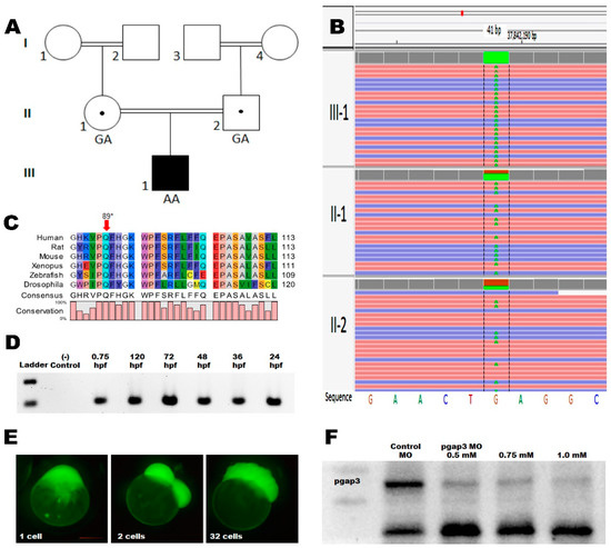 Molecular findings of the presented patient. (A) Pedigree of the studied family. (B) Sequencing gram showing PGAP3 mutation identified by whole-genome sequencing, c.265C>T-p. Gln89*. The grandparents from both sides are 1st-degree cousins. (C) Multiple species alignment of PGAP3 orthologs around the affected amino acid showing highly conserved p. Gln89 residue (red arrow). PGAP3 human (NP_001278659), rat (NP_001137367), mouse (NP_001028709), xenopus (NP_001072247), zebrafish (NP_001108063), and drosophila (NP_610223.1) using CLC Sequence Viewer, Qiagen Bioinformatics. (D) Gene expression at different developmental stages of zebrafish development by reverse transcriptase of total RNA. (E) Zebrafish morpholino-FITC injections were targeting the pgap3 ATG translation blocking site. The injected zebrafish embryo at 1-cell stage through cell divisions at two and 32-cell stage. Snap images using fluorescent imaging with Zeiss Lumar 12 microscope at 100× magnification, scale bar 200 μm. (F) Injected zebrafish total protein extracts analyzed by 10% SDS-PAGE, followed by immunoblot analysis using an anti-PGAP3 rabbit monoclonal antibody (1:300 dilution).