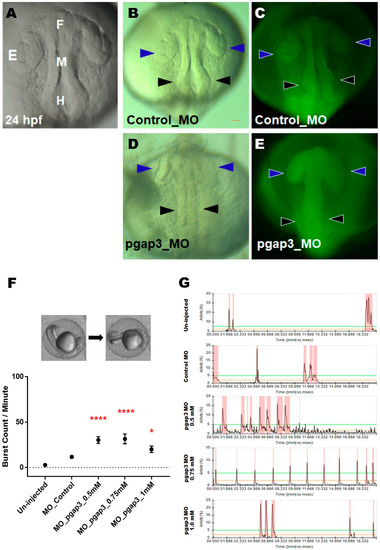 Zebrafish Pgap3 knockdown resulted in neural tube defect, delay in brain ventricles expansion, and seizure-related phenotype. Morpholino (MO)-based knockdown (0.5 mM) of zebrafish Pgap3 showed deficits in brain morphogenesis at 24 h post-fertilization (hpf) at the early stages of zebrafish brain development. Examination of pgap3 morphants demonstrated delayed development, fused neural tube into a continuous region, reduced expansion of the brain developing parts in the anterior-posterior direction, and defects in brain ventricles formation in comparison to control MO-injected group. (A) Illustration of zebrafish brain development at 24 hpf demonstrating the developing zebrafish brain composed of fore, mid and hindbrain. (B,C) Zebrafish control group image at brightfield and fluorescent FITC. (D,E) Zebrafish pgap3 morphant image at brightfield and fluorescent FITC. Arrowheads point to regions malformed in zebrafish pgap3 morphants. E: Eye; F: Forebrain; M: Midbrain; H: Hindbrain. Zebrafish imaging using Zeiss Lumar 12 stereomicroscope with ZEISS camera (Model Axiocam Erc 5s) at a magnification of 100×, scale bar 10 μm. (F) Zebrafish pagp3 morphants displayed significantly increased spontaneous head and tail coils at 24 hpf in comparison to the control group (un-injected); * p < 0.05, **** p < 0.0001. Locomotive behavior of zebrafish embryos after pgap3 MO injections assessed by spontaneous tail flicking and embryos movements that were measured by embryo burst count per minute and plotted into column graph for the mean with the standard error of the mean. N = 25, 34, 51, 36, 38 for the Control (un-injected), Control MO, pgap3 MO 0.5, 0.75, 1.0 mM, respectively. Statistical analysis was performed with one-way ANOVA followed by Dunnett’s test for multiple comparisons using GraphPad Prism (version 8.0). (G) Representative activity chart of zebrafish embryo at 24 hpf measuring movements through time for the zebrafish examined groups. Zebrafish imaging using Zeiss Lumar 12 stereomicroscope at a magnification of 10× supplied with Imaging source camera DMK 33UX252.