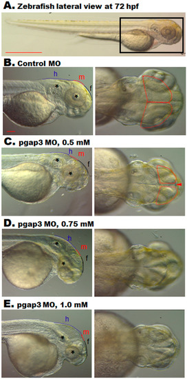 Phenotypic analysis by gross morphological examination demonstrated that Pgap3 knockdown resulted in developmental head deformities. Zebrafish pgap3 morphants displayed a reduction in the cephalic region and dysmorphic head features showing a bent head and low set of ears at 72 hpf (Figure 4). Head orientation abnormalities were initially observed in pgap3 morphants and associated with a deficit in brain ventricles expansion, midbrain conformation, and midbrain–hindbrain boundary (Figure 4C–E). In comparison to the control group (Figure 4A,B), the zebrafish showed a dose-dependent hypoplastic midbrain size, alteration in midbrain-hindbrain boundary, and significant delay in brain development (Figure 4C–E). Furthermore, the larval phenotypes mimic the dysmorphic features and brain anomalies exhibited by individuals with pathogenic variants in PGAP3. These characteristics get progressively worse with higher morpholino doses, suggesting that they result from depletion of Pgap3 protein in the developing zebrafish, demonstrating in vivo the essential function of this protein during the early stages of development.