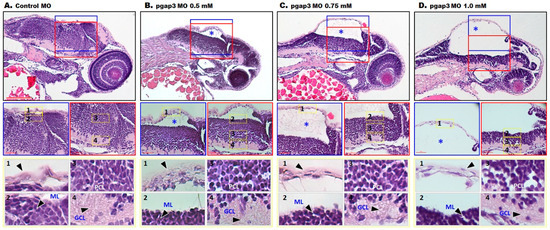Consistent with the clinical findings of corpus callosum agenesis in HPMRS4 patients, zebrafish pgap3 morphants displayed failure of developing a normal tectum that connects the left and right ventricles of the midbrain, a vital processing center for sensory information, by 72 hpf (Figure 4 and Figure 5). The morphants displayed clear separation of the two ventricles (Figure 4C–E, Figure 5B,F–H,J–L), impaired midbrain–hindbrain boundary formation and brain stem malformation in comparison to control zebrafish that had normal brain development, normal midbrain with connected and expanded left and right tectal ventricles and normal cerebellum formation (Figure 4A,B, Figure 5A,E,I). These findings were further supported by light-sheet imaging (Figure 5E–H) and luxol blue -cresyl violet staining (Figure 5I–L). Luxol fast blue stain is used to identify myelin in nervous tissue. The myelin proteolipid will display a dark blue precipitate, the gray matter will be colorless, and the white matter will be blue [25]. In contrast, to the control group (Figure 5I), pgap3 morphants displayed distanced tectal ventricles and impaired myelination of the nervous tissue was observed under Luxol fast blue staining (Figure 5J–L) mimicking hypomyelination seen in some HPMRS4 patients. The histopathological examination revealed a prominent difference in terms of degenerative changes in brain tissue of the zebrafish Pgap3 knockdown model. The model showed reduced brain size, dilated ventricle, poorly organized brain cellular components (Figure 6B–D). The examined brain three layers (molecular layer, Purkinje cell layer, and granule cell layer) established the effect of Pgap3 on the developing brain showing a dose-dependent reduced area size and cellular density (Figure 6B–D, blue and red square) with degeneration of the granule layer (Figure 6B–D, subsets 4) of the cerebellum that comprise the largest population of neurons in the vertebrate central nervous system (Figure 6).