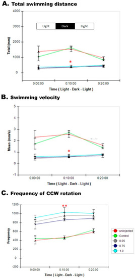 Zebrafish larvae locomotor activity was monitored at 120 hpf using an automated Video-Track system (Noldus, Ethovision XT, Wageningen, the Netherlands), as described previously [28]. Larvae were placed individually in a 6-well plate in embryo medium. Larval swimming behavior was monitored in response to dark-to-light transitions (3 cycles of 10 min, each starting with the light). The Ethovision system was equipped with a BASLER camera and set to 30 frames per second. In each cycle, we recorded the frequency of movements, distance traveled, and the total duration of movements. Four technical replicates for each group were performed. The locomotor behavior was monitored, and the collected data were analyzed using Ethovision XT software.