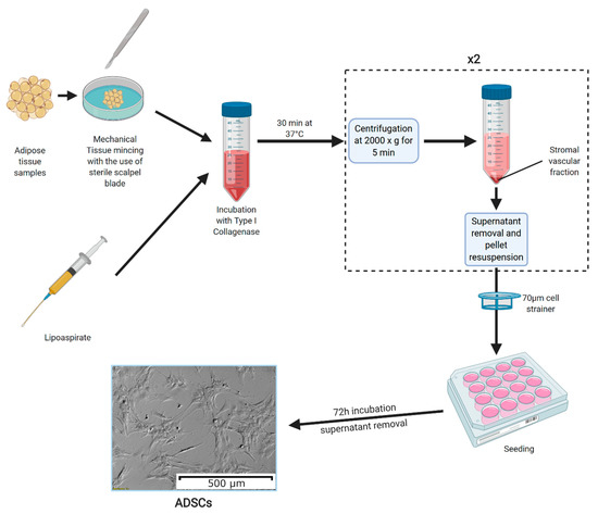 The methods of adipose-derived stem cell (ASC) culture preparation. Adipose tissue samples are mechanically minced into small fragments (the process is not needed if ASCs are obtained from lipoaspirates). Then, the tissue fragments are incubated in a solution of type I collagenase for 30 min at 37 °C. The collagenase is neutralized using a 5% fetal bovine serum solution in culture medium, with the samples centrifuged afterwards at 2000× g for 5 min. Furthermore, the resulting supernatant is discarded, and the pellet is resuspended in culture medium, after which the centrifugation step is repeated. The obtained pellet is again resuspended and filtered through a 70 µm cell strainer. The resulting cell suspension is seeded onto culture plates and left to adhere for 72 h. After this time, the culture medium is removed, leaving ASCs adhered to the plate bottom [13]. The photograph of ASC morphology was taken using an inverted microscope with 10× magnification lens. Created with Biorender.
