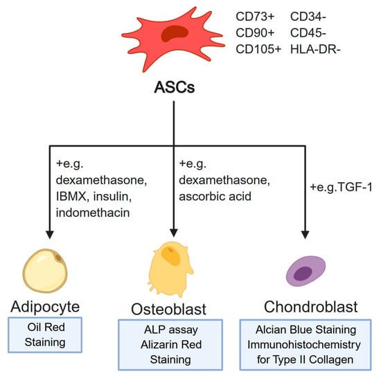 ASCs obtained through the abovementioned methods can be further identified using two basic approaches. Firstly, cell surface proteins that are characteristic for this MSC population can be detected through methods such as flow cytometry. The available literature describes the minimal set of markers necessary for positive identification of MSCs [14,15]. The cells need to be CD73, CD90, and CD105 positive, and at the same time not exhibiting the expression of CD34, CD45, and HLA-DR [16]. However, the final confirmation of the MSC phenotype of ASCs is their ability to differentiate into three characteristic lineages [14]. Firstly, upon the addition of factors such as dexamethasone and ascorbic acid, the cells should assume osteoblast phenotype [17]. Then, differentiated osteoblasts can be detected using ALP (alkaline phosphatase) assay or alizarin red staining [18]. Furthermore, the addition of TGF-β1 stimulates ASC differentiation towards the chondrogenic lineage [19]. In this case, the successful lineage commitment can be detected using either alcian blue staining, or immunocytochemistry targeted at detecting type II collagen formations in the cells [20]. Finally, adipocyte differentiation is achieved through addition of factors such as dexamethasone, IBMX, insulin, and indomethacin to the culture medium, with the resulting cells detectable using Oil Red staining [21]. The complete minimal criteria for characterization of MSC characteristics of ASCs are presented in Figure 2.