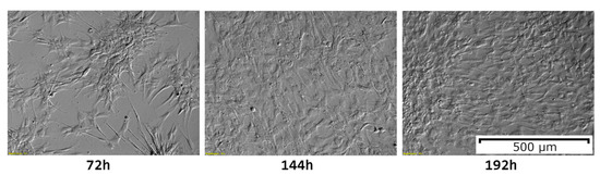 ASCs can be relatively easily maintained in culture, ready to be passaged or harvested after around 192 h [22]. FBS (fetal bovine serum) is the most commonly used serum supplement of such cultures. However, some sources suggest alternative sources of growth factors for the ASCs [23]. Human platelet cell lysate addition causes a significant increase in cell proliferation as compared with FBS, and it has been shown to cause some gene expression changes, which could have some influence on the overall properties of ASCs [24,25]. In turn, when allogenic human serum was also examined as a supplement, it was shown to be slightly less potent, requiring higher concentrations than FBS to achieve the same effect [26]. Most of the sources agree that the cells should be harvested at the confluence of 90–95%, as cultures of excessive density can affect their gene expression [13,27]. Density dependent changes in ASC morphology are presented in Figure 3.