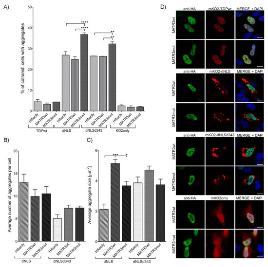 Co-transfection of either dNLS or dNLSd343 with MATR3wt (Supplementary Data, Figure S2B) had no effect on the percentage of cells with dNLS (24.9 ± 1.34%) or dNLSd343 (26.5 ± 0.10%) aggregates. On the other hand, MATR3mut co-transfected with either dNLS or dNLSd343 significantly increased the percentage of cells harboring both dNLS (36.9 ± 0.75%) and dNLSd343 (32.3 ± 1.02%) aggregates (Figure 3A). However, while neither MATR3wt nor MATR3mut displayed an effect on the number of aggregates within an individual cell (Figure 3B), both MATR3wt (5.1 ± 0.26 µm2) and MATR3mut (3.7 ± 0.30 µm2) evidently increased the size of aggregates in cells co-transfected with dNLS (Figure 3C,D). This was also confirmed by the detection of dNLS in UREA-soluble fraction with Western blot, demonstrating that the co-transfection of MATR3wt and dNLS produces more insoluble aggregates than the co-transfection of dNLS with MATR3mut in the cells (Supplementary Data, Figure S3B). These results are implying that even though MATR3wt does not seem to promote aggregate formation to the extent that its mutated form does, it nonetheless similarly promotes TDP-43 dNLS aggregate maturation, irrespective of TDP-43 C-terminal truncations.