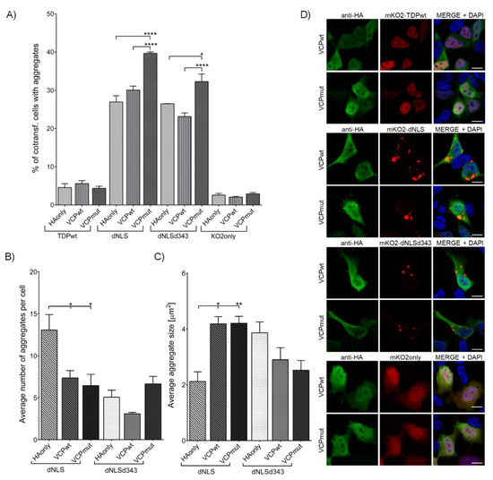 The co-transfection of dNLS or dNLSd343 with VCPmut (Supplementary Data, Figure S2C) resulted in significantly increased percentage of cells harboring dNLS (39.7 ± 0.36%) and dNLSd343 (32.3 ± 1.97%) aggregates in comparison with the cells co-transfected with VCPwt (dNLS (30.1 ± 1.04%) and dNLSd343 (23.1 ± 0.95%)) or control plasmid HAonly (dNLS (27.0 ± 1.64%) and dNLSd343 (26.5 ± 0.05%)) (Figure 4A). However, the average number of dNLS aggregates in individual cell decreased in both VCPwt (7.4 ± 0.87) and VCPmut (6.4 ± 1.35) co-transfected cells, compared to HAonly co-transfected cells (13.1 ± 1.82) (Figure 4B). Nevertheless, the size of dNLS appeared increased in both VCPwt (4.2 ± 0.25 µm2) and VCPmut (4.2 ± 0.24 µm2) co-transfected cells, compared to HAonly (2.1 ± 0.34 µm2) (Figure 4C,D). Additionally, the insolubility of dNLS aggregates was confirmed by Western blot detection of dNLS in UREA-soluble fraction (Supplementary Data, Figure S3C). No such distinct effect was noted in co-transfections of VCPwt (2.9 ± 0.43 µm2) and VCPmut (2.5 ± 0.35 µm2) with dNLSd343, suggesting the involvement of IDR2 domain of TDP-43 in VCP interactions, and its necessity for TDP-43 aggregate maturation.