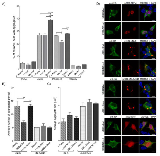 Similar to VCPmut, the co-transfection of TDP-43 dNLS construct with UBQLN2mut (Supplementary Data, Figure S2D) (39.0 ± 0.83%) led to an increased percentage of cells harboring aggregates in comparison to HAonly (27.0 ± 1.64%) or UBQLN2wt (27.0 ± 0.92%) (Figure 5A). On the contrary, the co-transfection of dNLSd343 with UBQLN2wt (21.5 ± 1.21%) resulted in the decreased percentage of cells containing aggregates, as compared to HAonly (26.5 ± 0.05%) or UBQLN2mut (28.1 ± 0.07%) co-transfected cells. UBQLN2 seems to have an impact on TDP-43 dNLS aggregate initiation, as the co-transfection of TDP-43 dNLS and UBQLN2wt (6.9 ± 0.70) extensively decreased the number of dNLS aggregates within the individual cells (Figure 5B), though with no effect on the dNLS aggregate size or intracellular distribution noted (Figure 5C,D). However, the higher percentage of cells with dNLS aggregates, combined with an increased number of aggregates in an individual cell co-transfected with UBQLN2mut and dNLS, resulted in a higher amount of RIPA-insoluble dNLS aggregates in comparison to co-transfection of dNLS and UBQLN2wt (Supplementary Data, Figure S3C).