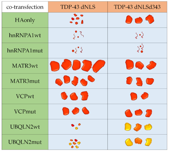 First, we developed a novel in vitro TDP-43 aggregation model in the neuroblastoma SH-SY5Y cell line. To achieve TDP-43 cytoplasmic aggregation, we eliminated NLS from the full-length TDP-43 sequence. Then, we stepwise shortened its LCD (containing IDR and CR domains), to disrupt the physiological conformation of TDP-43 dimers. We left the N-terminal region of TDP-43 intact, as it is necessary for its oligomerization and phase-separation, although some studies have achieved TDP-43 aggregation with only the C-terminal region present [47,48]. Full-length TDP-43 lacking only NLS (dNLS) and TDP-43 without NLS and IDR2 (dNLSd343) constructs were used in co-transfection experiments, to assess the impact of wild-type and mutant ALS-associated genes on TDP-43 aggregate behavior. Heterogeneous nuclear ribonucleoprotein A1 (hnRNPA1), matrin-3 (MATR3), valosin-containing protein (VCP) and ubiquilin-2 (UBQLN2) were selected for their involvement in RNA metabolism, or as a part of protein turnover machinery. Our results confirm the unique influence of these genes and their ALS-related mutants on TDP-43 aggregation behavior, suggesting a possible origin for ALS protein inclusions heterogeneity, and different modes of disease progression.