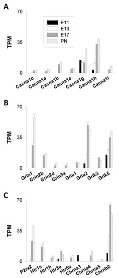 Genes coding for voltage-gated and ligand-gated Ca2+ channels (VGCC and LGCC, respectively). The figure shows the expression of genes coding for the pore-forming subunits of VGCC (A); ionotropic glutamate receptor subunits (B); and adenosine triphosphate (ATP)/purinergic, 5-hydroxytryptamine (serotonin), and nicotinic acetylcholine receptor subunits (C). Throughout this study, the abundance of transcripts is presented in transcripts per million (TPM), and only genes displaying TPM values ≥ 2 were considered to be significantly expressed. Four ages were studied: embryonic days 11 (E11), 13 (E13), and 17 (E17), and post-natal day 1 (PN1). The mean +/− standard error of mean (SEM) is shown from n = 3 distinct biological samples. All the data presented were extracted from a genome-wide transcriptome sequencing (RNA-Seq) analysis (Hasna et al., 2019).