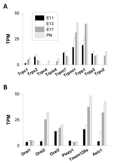 Only four Trp channel genes displayed TPM values > 2 at the beginning of corticogenesis (E11–E13): Trpml1, Trpp2, Trpm7, and Trpc2. The other Trp members had TPM values < 2, a finding consistent with the notion that most Trp channel transcripts are present at low levels in many organs []. Transcripts of Trpc1 and Trpv2 could be quantified at the end of corticogenesis (E17) whereas Trpc4 transcripts were noticeable only postnatally. Previous studies addressed the question of the expression of murine Trp channel genes but focused on a specific subset of genes, without considering, for instance, the TRPP and TRPML channel subfamilies [,]. Here, all mammalian TRP subfamilies were analyzed. This provides a clearer picture of the Trp gene expression profile during murine corticogenesis.