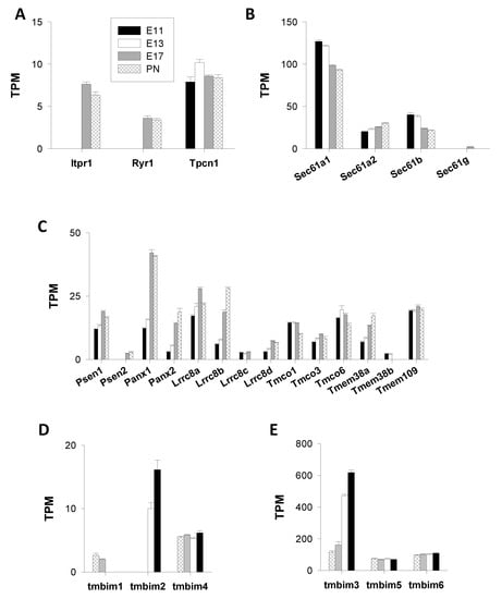 Translocons are protein complexes forming pores that allow the translocation of polypeptides across membranes. The functional core of mammalian translocons involves Sec61 proteins []. These can mediate ER Ca2+ release, making Ca2+ leak channels ubiquitous, particularly Sec61A1 [,]. The following Sec61 transcripts were analyzed: Sec61a1–a2, Sec61b, and Sec61g. Sec61a1 was the major Sec61 gene with a high abundance of transcripts (TPM values >90). Interestingly, the expression of Sec61a1 was repressed with TPM values diminishing from 127 (at E11) to 93 TPM (at PN1). A similar trend was observed for the less-expressed gene Sec61b, with TPM values declining from 40 to 22 (Figure 3B). Conversely, Sec61a2, although less expressed, was positively regulated (from 20 to 30 TPM). The expression of Sec61g was detected only at PN1 (Figure 3B). For the sake of clarity, the analysis of the other putative leak channel genes is shown in a distinct graph because the TPM values were much smaller, ranging from 2 to 40 (see Figure 3C).