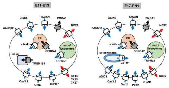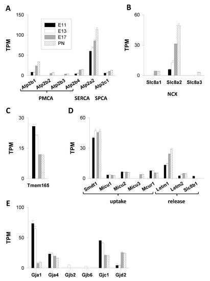 The aim of this report was to provide a detailed picture of the expression of genes encoding the putative plasma membrane and organellar Ca2+-transporting proteins during embryonic cortical formation and development. The work is based on a recent genome-wide transcriptome sequencing (RNA-Seq) analysis estimating gene expression []. Tissues were collected at four ages: embryonic days 11 (E11), 13 (E13), and 17 (E17), and post-natal day 1 (PN1) corresponding to four crucial stages: when the neural progenitor cells begin to differentiate into neurons (E11), the peak (E13) and end of neurogenesis (E17), followed by the beginning of the maturation process and circuit assembly (PN1). The report is divided into two parts: the first part is a genome-scale profile of gene expression that is further subdivided into five chapters covering the following topics: (1) channels, (2) Ca2+ ATPases, (3) exchangers, (4) antiporters, and (5) mitochondrial actors. The second part of the report is devoted to the main functional Ca2+ transport systems present in E13 cortical cells.
