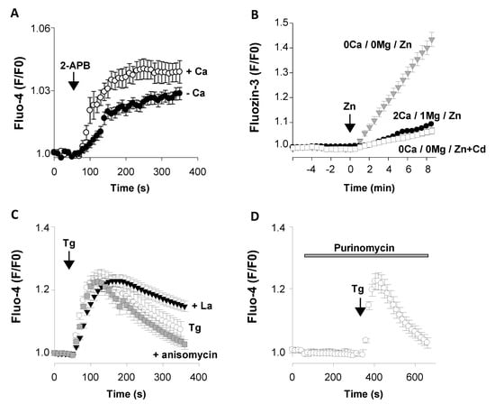 Cytosolic zinc (Zn2+) rises were monitored following the same experimental conditions and setup as described above, except the cells were incubated with the fluorescent Zn2+ dye FluoZin3 [,]. When used, the Ca2+ and Mg2+ free recording solution consisted of (in mM): 150 NaCl, 5 KCl, 5.5 glucose, and 10 HEPES (pH 7.4). The Fluo4 and FluoZin-3 signals were expressed as F/F0, with F being the fluorescence at each time point and F0 being the mean baseline fluorescence monitored for 1 min before the addition of any substance. The coverslips were used once and never reused.