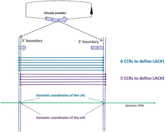 CircRNA production was detected in this region by identifying two clusters of circular chimeric reads (CCRs). The first (in blue) and the second (in purple) contain six and five CCRs, respectively. The two fragments of each CCR are mapped in inverted order on the chromosome. The clustering of CCRs by identical genomic coordinates leads to two loci associated with circRNA production (LAC). Two LACs were thus observed, even if their genomic coordinates differed by only one nucleotide. Contrary to most authors, we do not consider that each LAC defines a distinct circRNA. When we examined the sequence contents of CCRs from different LACs, we observed that several LACs can describe a single circularization event (a single circRNA).