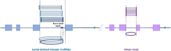 Although the discovery of RNA molecules with a circular configuration dates back four decades, for many years they were dismissed as being too few or as resulting from splicing errors [1]. From 2012 on, advances in high throughput sequencing revealed the presence of circular RNAs (circRNAs) in mammalian cells and in different cell lines [2]. In the meantime, evidence has accumulated that circRNAs are evolutionarily conserved and their expression levels vary with the tissue and with the developmental stage, suggesting that circRNAs have regulatory functions [3,4]. Circular RNA are probably a natural byproduct of the splicing process in all eukaryotes [5]. Splicing is the mechanism by which nascent precursor messenger RNA (pre-mRNA) is edited into mature mRNA and which is mediated by a protein–RNA complex known as the spliceosome. Typical human genes have eight introns, and each intron causes the de novo assembly of a spliceosome; multiple spliceosomes are necessary to remove introns from the pre-mRNA body. During the splicing of a pre-mRNA, introns are spliced in the form of a lariat intronic RNA and exons are joined together. The biogenesis of the two types of circRNA described so far is related to these two aspects of pre-mRNA splicing [3].