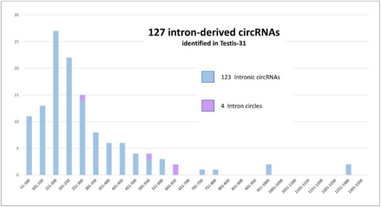 The height of the bars represents the size of the 127 intron-derived circRNAs identified in the Testis-31 dataset. A total of 123 lariat-derived intronic circRNA (in blue) and 4 intron circles (in purple) were detected in the dataset. The circRNAs were divided into groups according to their size (x axis) and the number of circRNAs concerned is shown on the y axis.