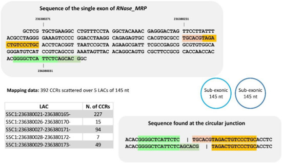 To improve our knowledge of sub-exonic circRNAs and because some are very small, we examined the CCRs and their mate pairs identified in three sets of LACs from the RNase-MRP (nc gene, SSC1). Our examination of the sequence content of the reads of the first one comprising five LACs (145 nt), leads us to propose only two distinct sub-exonic circRNAs (145 nt) (Figure 6, and details in Supplementary Doc. 3A2). For the second one identified by three LACs (115 nt), all reads examined were compatible with a single sub-exonic circRNA including 115 nt (Supplementary Doc. 3A3). In the last region examined (Supplementary Doc. 3A4), sub-exonic(s) circRNA(s) of 61 nt was suspected. We were surprised to see that a large proportion of CCRs were 125 bp long (the dataset contains a mix of 2 × 100 and 2 × 125 bp). Consequently, one would expect to find the circular junction of such a small circRNA (61 nt) twice in a read of 125 bp, which would give rise to more than two segments. Among the CCRs with a length of 125 bp, we found sequences that are not compatible with the hypothesis of a circRNA of 61 nt (Supplementary Doc. 3A4). In these sub-exonic circRNAs, we observed shifts in alignment in identical sequences and the number of distinct circRNAs was less than the number of LACs.