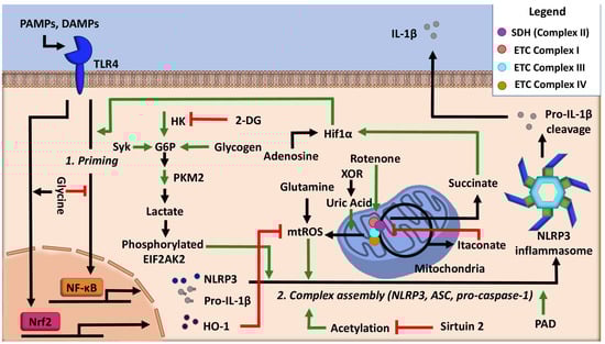 Regulation of NLRP3 inflammasome activity by cellular metabolic pathways. Stimulating macrophages with a priming signal increases the production of succinate, which stabilizes hypoxia-inducible factor 1-alpha (HIF-1α). Hif1α, also activated by adenosine, enhances the transcription of IL-1β. Inflammasome assembly is assisted by glycolytic flux and acetylation, which can be inhibited by 2-deoxy-D-glucose (2-DG) and Sirtuin 2, respectively. Itaconate inhibits succinate dehydrogenase (SDH) and reduces mitochondrial (mt)ROS, along with glycine, which enhances Nrf2-mediated cellular stress responses to inhibit inflammasome activation. Glutamine and xanthine oxidoreductase (XOR) via uric acid enhance mtROS. Green lines denote the promotion of NLRP3 activity, whereas red lines denote the inhibition of NLRP3 inflammasome activity. DAMPs: danger-associated molecular patterns, EIF2AK2: eukaryotic translation initiation factor 2 alpha kinase 2, G6P: glucose-6-phosphate, HK: hexokinase, PAD: protein arginine deiminase, PAMPs: pathogen-associated molecular patterns, and PKM2: pyruvate kinase M2.