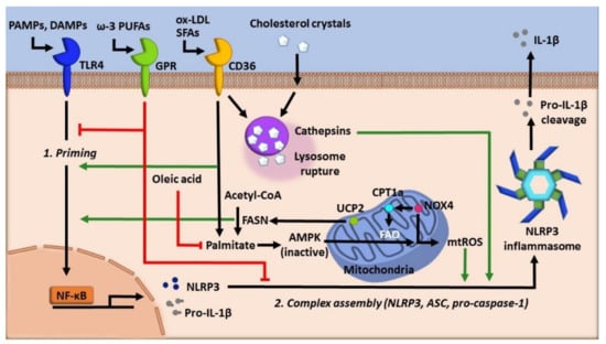 As mentioned, fatty acids can have highly variable degrees of carbon chain saturation, which dictates their function. Most studies implicate two specific fatty acids, the saturated fatty acid, palmitic acid, and the monounsaturated fatty acid, oleic acid, in the regulation of the inflammasome, both of these lipids can be synthesized in humans, and they can also be taken in by diet (Figure 3). Saturated fatty acid-enriched high-fat diets are well known to be associated with inflammation and, as such, are increasingly being linked to inflammasome activity [60,73,74,75,76,77,78]. For example, it has been shown that exogenous palmitate inactivates AMPK, which impairs autophagy and promotes the generation of mtROS [60]. The production of mtROS then drives the NLRP3 inflammasome activation and IL-1β secretion.