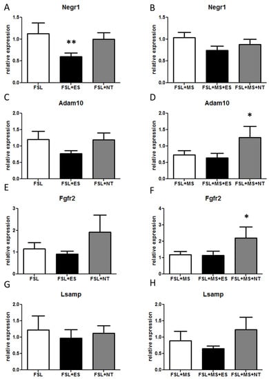 mRNA levels of genes belonging to the Negr1-Fgfr2 pathway in the hippocampus after ES or NT or vehicle administration. FSL rats were either left undisturbed in their home cage (n-MS, A,C,E,G) or exposed to MS (B,D,F,H) as described in the Methods section. (A,B) Negr1 expression; (C,D) Adam10 expression; (E,F) Fgfr2 expression; and (G,H) Lsamp expression. * p < 0.05 in the planned comparison vs. vehicle; n = 8–10.