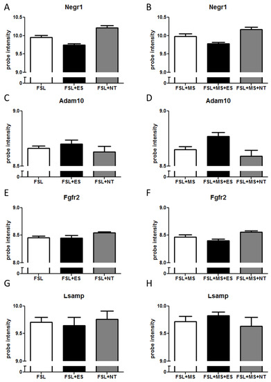 FSL rats subjected, or not, to MS were treated with ES or NT and a global transcriptomic analysis was carried out in the hippocampus and prefrontal cortex. The experimental design was the same, with FSL rats subjected to MS and receiving chronic antidepressant treatment. Parallel groups of n-MS FLS rats which were not treated with antidepressants formed the control groups. We extracted the expression results from probes specific for genes belonging to the Negr1-Fgfr2 pathway and compared them in all experimental groups.