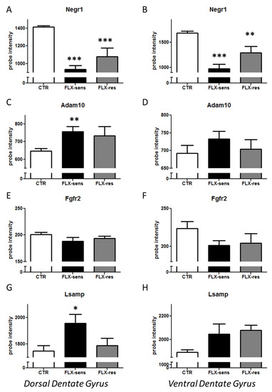 mRNA levels of genes belonging to the Negr1-Fgfr2 pathway in the dorsal dentate gyrus (A,C,E,G) or ventral dentate gyrus (B,D,F,H) of the hippocampus after fluoxetine or vehicle administration. Groups showing fluoxetine behavioural sensitivity or resistance are shown as black or grey columns, respectively. (A,B) Negr1 expression; (C,D) Adam10 expression; (E,F) Fgfr2 expression; and (G,H) Lsamp expression. * p < 0.05, ** p < 0.01, *** p < 0.001 in the planned comparison vs. vehicle. FLX: fluoxetine. n = 4–8.