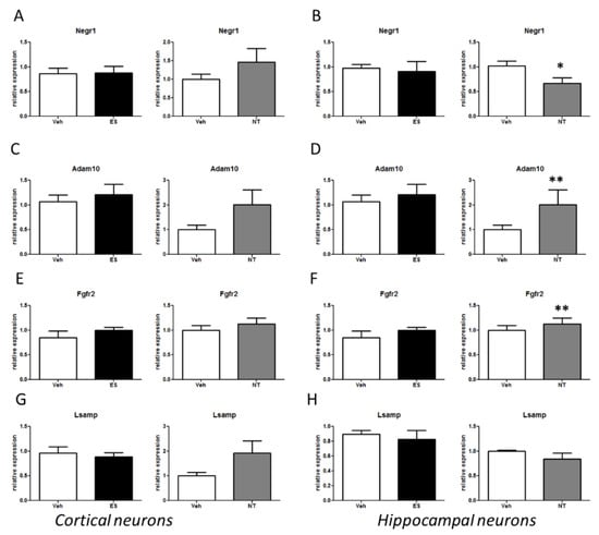 The data obtained in two different rodent models of MDD showed that chronic antidepressant treatment alters gene expression in the Negr1-Fgfr2 pathway. Next, we aimed to investigate whether the alterations in the Negr1-Fgfr2 pathway that we detected in rodent MDD models were directly cell-autonomous or network-based. Several findings show that anti-depressant treatment induces cell-specific molecular alterations. Thus, we analysed the impact of chronic treatment with ES or NT in two well-established in vitro neuronal models, namely primary cortical and hippocampal cultures. We treated cells every second day starting at DIV5 either with ES (5 µM) and vehicle (DMSO) or NT (1 µM) and vehicle (water). At DIV14, we extracted the mRNA and analysed by qPCR the relative expression of Negr1, Lsamp, Adam10, and Fgfr2. Neither ES nor NT treatments had an overt effect on Negr1 and its related pathway in the cortical cultures (Figure 5). Instead, chronic treatment with NT induced a significant decrease of Negr1 and increase of Adam10 and Fgfr2 expression in the hippocampal cultures (Negr1 p < 0.05; Adam10 p < 0.01; Fgfr2 p < 0.01; Figure 5B,D,F).