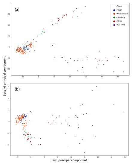 Figure 1 shows two scatterplots with the first two principal components (PCs) of a principal component analysis (PCA) as x- and y-axis. The datapoints display all 229 samples used in this work. The PCs are computed from CpG sites (a) as well as CpG islands (b) as features of the respective input data to the PCA. It can be used to get an overview of the data and see if the liquid biopsy datasets are distinguishable from the blood datasets with unsupervised techniques. It can be observed that the liquid biopsies appear closer to the blood than to the solid tumour samples, which is to be expected. Nevertheless, the liquid biopsy samples can be distinguished clearly from the PBMC as well as the whole blood data. However, the differences between the healthy (green) and cancerous (red) cfDNA are not as clear if the whole dataset is used as input.