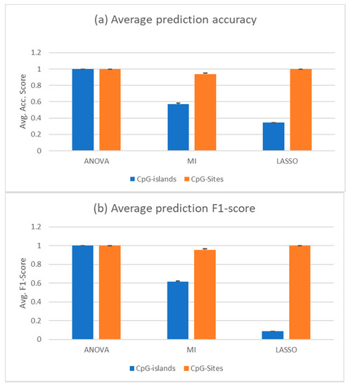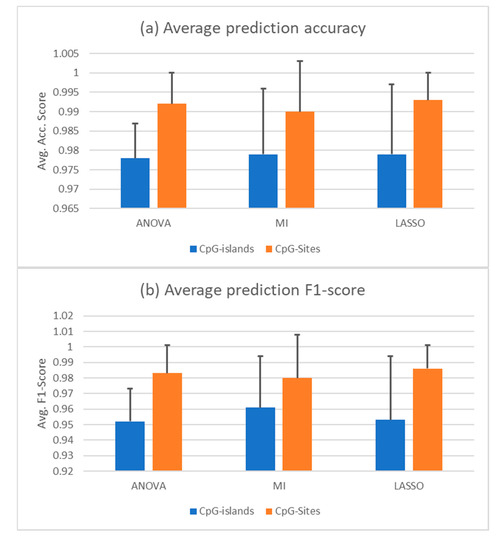 Since the PCA shows that the correct distinction of healthy and cancerous cfDNA samples will not be trivial, we employed three different feature selection techniques to shrink the dimension of the features in our dataset. High-dimensional data in relatively low sample sizes are hard to manage for machine learning applications. Therefore, data processing and feature selection are imperative for an efficient learning algorithm. In this work, we tested the ANOVA F-value, mutual information (MI), and LASSO feature selection methods. Given a set composed of all the datasets shown above, a random forest trained with features selected by all three feature selections was able to identify cfDNA samples as healthy or cancerous. The dataset was split randomly to a training set of 60% of the sample size and a test set of 40%. Using ANOVA in combination with random forest yielded an average accuracy score of 0.98 +/– 0.009 in a 10-fold cross validation, in which specificity was 0.96 +/– 0.048 and sensitivity was 0.97 +/– 0.038. Combined with MI selection, the classifier achieved an average accuracy of 0.98 +/– 0.017, showing a sensitivity of 0.99 and a specificity of 0.96 +/– 0.018 representing the best results in classifying the cancerous samples in this composition of data and a randomly split training and test set. With LASSO, the average accuracy in a 10-fold cross-validation was 0.98 +/– 0.018. Sensitivity was 0.98 +/– 0.019 and specificity was 0.98 +/– 0.023. The AUROC and average precision score are nearly 1 in all three combinations, which is due to using AUROC as a scoring function for the hyperparameter tuning. The average accuracy and F1 scores for all three selection methods in combination with a random forest are given in Figure 2a,b in comparison to the same predictions based on CpG sites instead of CpG islands. The F1 score is a combination metric of the positive predictive value, which is also called precision, and the sensitivity, which is often called recall.