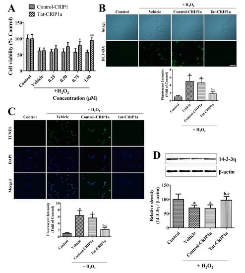 To elucidate the possible neuroprotective mechanisms of Tat-CRIP1a against H2O2-induced oxidative damage, HT22 cells were incubated with 1 μM His-CRIP1a or Tat-His-CRIP1a proteins for 1 h and then treated with 1 mM H2O2 for 3 h. Western blot was conducted using a rabbit anti-14-3-3η antibody (1:1000; Merck Millipore, Temecula, CA, USA) as described in a previous study [].