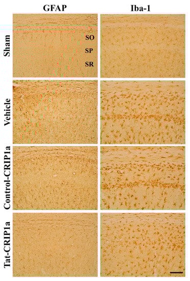Immunohistochemistry for glial fibrillary acidic protein (GFAP) and Iba-1 in the cornu Ammonis (CA)1 region of the sham, vehicle, Control-CRIP1a, and Tat-CRIP1a groups at 4 days after ischemia. In the vehicle group, GFAP-immunoreactive astrocytes have hypertrophied cytoplasm and processes and ionized calcium-binding adapter molecule 1 (Iba-1)-imunoreactive microglia with hypertrophied cytoplasm with retracted processes. In the Tat-CRIP1a group, astrocytes and microglia with activated phenotypes were markedly decreased. Scale bar = 100 µm. SO, stratum oriens; SP, stratum pyramidale; SR, stratum radiatum.