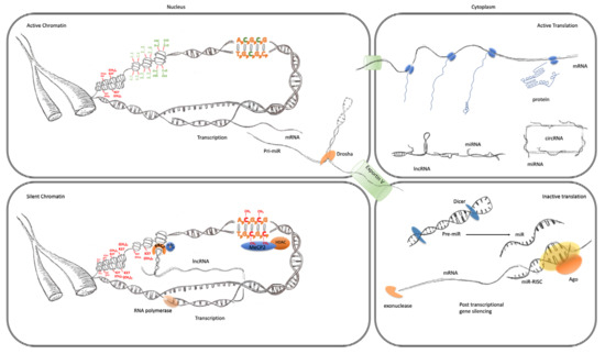 Transcriptional and post-transcriptional regulation of gene expression. The four panels of this schematic are representative of the major epigenomic mechanisms’ associated active and inactive states in the nucleus and cytoplasm. Active chromatin (top left) characterized by an expanded or open euchromatin domain is established by the depletion of histone H3 lysing 27 trimethylation (K27(CH3)3 red) and an increase in histone H3 and H4 acetylation (green). This gives rise to mRNA transcription and non-coding RNA, such as primary miRNA transcripts. After interaction with the microprocessor complex (Drosha/DGCR8), the processed pre-miR are exported to the cytoplasm via exportin 5. mRNA is also exported to the cytoplasm (top right panel) where it becomes associated with ribosomes and translated into protein (blue). This is facilitated by the suppression of potentially active miRNA, which are sequestered through interaction with lincRNA and circRNA. Inactive chromatin (bottom left) is associated with cytosine methylation (red), which is particularly important at CpG islands and promoters where they can bind to MeCP2 which can recruit histone de-acetylases (HDAC). These reduce histone acetylation, which leads to greater compaction of chromatin into a state known as heterochromatin. LincRNA transcripts can also form a scaffold for the assembly of a ribonucleoprotein complex, including the PRC2, that directs the activity of histone methyltransferases (HMTs) that catalyze the trimethylation of histone H3 lysine 27. This modification also further enhances the contraction of chromatin into inactive heterochromatin. Post-transcriptional regulation of gene expression (bottom right panel) can also be facilitated by the maturation of pre-miRs through the activity of dicer. The mature miRNAs guide the RNA-induced silencing complex (comprising Argonaute proteins and other co-factors) to the 3′UTR of their cognate mRNA, causing translational repression and degradation through exonuclease activity.