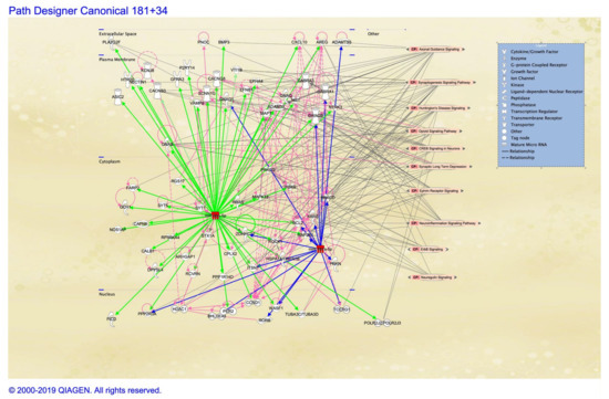 Putative target gene interaction network graph generated using Ingenuity Pathway Analysis of miR-34 and miR-181 family miRNAs nodes within a simulated cell. Target mRNA interactions are denoted by green and blue edges for the seed sequences GGCAGUG and ACAUUCA using high stringency target predictions (TargetScan) and experimental observation for miR-34 and miR-181, respectively. Protein–protein interactions between miRNA targets are illustrated in pink. Gene ontologies related to neural functions are projected from the right side (grey lines) with the highest number of interactions at the top (axonal guidance signaling) and the least at the bottom (neuregulin signaling).