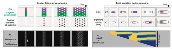 Similarities in molecular and cellular bases of patterning in different systems. During the patterning of both feather follicle arrays (marked by β-catenin expression) or tooth signalling centres (marked by Shh expression), Eda/EdaR allow visualizing morphogenetic waves, which are also characterised by a local increase in cell density and proliferation. In the first case, the wave travels along the medio-lateral axis, while in the second, timely regulation occurs during antero-posterior growth. Simulations of mathematical models composed of Turing-type reaction-diffusion, chemotaxis (and logistic proliferation in the case of follicles) can reproduce spatial dynamics of EdaR, Eda, or β-catenin expression and proliferation during tissue differentiation (high levels of β-catenin or EdaR expression respectively appear in white and yellow in simulations). Adapted from [37,41].