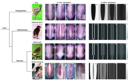 In vivo/in silico dynamics of dorsal feather follicle patterning in avian species. In the emu embryo, feather follicles appear simultaneously within large β-catenin-expressing areas initially covering the dorsal skin region expect for its medial-most part. In the Japanese quail and the zebra finch, dorsal follicles appear in a sequential manner from β-catenin-expressing longitudinal lines. In the Gentoo penguin, β–catenin is expressed in two bilateral expressing areas followed by a central area; follicles rapidly appear in the herein defined zones. Computer simulations of a unified model combining reaction-diffusion, chemotaxis and logistic proliferation recapitulate all dynamics when applied to species-specific axial initial conditions. This predicted that patterning sequentiality is due to spatially confined symmetry breaking in the dorsal skin of bird embryos. Adapted from [37]. Photo credits: Manceau laboratory, Paris, France (Japanese quail), Wikimedia (finch), Jooin (emu) and ©Raphaël Sané (www.raphaelsane.com; Gentoo penguin).