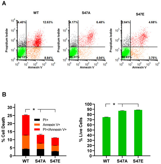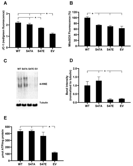 3.3. S47E Cytc Expressing Cells Have a Lower Mitochondrial Membrane Potential (ΔΨm) That Corresponds to Lower ROS Production