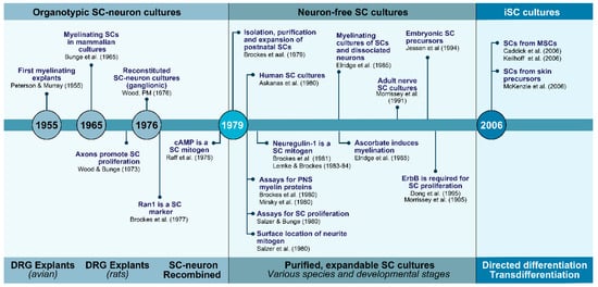 The evolution of SC cultures: from tissue culture to cell culture and beyond. The timeline summarizes some of the major technological and conceptual achievements by many contributing laboratories for over half a century. Main advancements facilitated the transition from culturing SCs within neural tissues (1960s and 1970s) to culturing SCs from neural tissues but in the absence of other cell types (1970s and 1980s). A new set of in vitro technologies are behind the creation of SCs from non-neural cells such as MSCs (2000s-). Some key innovations were represented in the timeline itself along with their references. Other descriptions and citations can be found in the text.