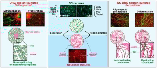 Achieving myelin formation is the most desirable endpoint for cultured SCs in general as it represents the highest level of maturation. Whereas oligodendrocytes can form myelin-like membranes in the absence of neurons and even provide a myelin sheath to artificial nanofibers [134], SCs would only form myelin in response to signals emanating from living axons. Besides, myelination is seen only when SCs have succeeded in sorting the axons into one-to-one SC–axon units and when the axons have achieved a minimum diameter of about 1 micron. To date, most studies have employed dissociated or non-dissociated DRG neurons whose neurites provide a substrate for SCs to attach, proliferate, and in due time differentiate (Figure 2). It is common practice to purify the SC cultures as well as to subject them to expansion before seeding them onto the neurons to demonstrate the SC’s functionality towards myelin differentiation [43]. The availability of neuronal cells rather than SCs poses a limit to large-scale experimentation but empirical data have shown that not all axonal systems are myelinatable by SCs in vitro. Even though SCs can myelinate different types of axons in vivo, including axons of CNS origin, sensory neurons from the DRG are the most popular for SC myelination in vitro. To our knowledge, DRG neurons constitute the only well-documented system supportive of myelination after neuron–SC recombination in culture with the consideration that not all individual DRG axons are effectively myelinated by SCs. One clear example is the observation that the DRG axons themselves partition into those that support MPZ expression and myelin formation by axon-engaged SCs and those that do not [135]. The receptivity of axons for myelination can vary according to NGF-dependent signals [136], the levels of expression of neuregulin I type III [137], and possibly other factors.