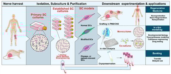 The applications of cultured SCs are broad. For simplicity, this section has been focused on introducing two key areas with high potential for translation: cellular therapies (Section 5.1) and in vitro modeling of normal and abnormal SC development and physiology (Section 5.2).
