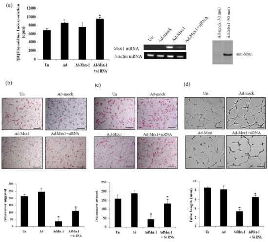 Msx1 inhibits endothelial cell migration, invasion, and tube formation in vitro. (a) siRNA-mediated suppression of Msx1 in HUVECs. HUVECs were either uninfected (Un) or infected with Ad-Mock, Ad-Msx1, or Ad-Msx1 with siRNA for Msx1 (Ad-Msx1+siRNA) for 18 h and then treated with the vascular endothelial growth factor (VEGF) (10 ng/mL) for 24 h. Expression of Msx1 was confirmed by RT-PCR and immunoblotted with anti-Msx1 antibody. Incorporated [3H]-thymidine was determined by liquid scintillation counting. (b and c) Uninfected HUVECs and indicated adenovirus-infected HUVECs were seeded onto Transwells for migration assay (b) or on Matrigel-coated Transwells for invasion assay (c), followed by stimulation with VEGF (25 ng/mL) for 24 (b) or 30 h (c), respectively. The number of migrated or invaded cells was counted under a light microscope, and mean values were determined. Independent experiments were repeated three times, and error bars correspond to 95% confidence intervals. * p < 0.05 compared to uninfected controls. (d) Uninfected HUVECs and adenovirus-infected HUVECs were plated on growth factor-reduced Matrigel and then treated with or without VEGF (10 ng/mL) for 48 h. Formation of tubular structures was detected by an inverted microscope. Tube lengths were quantified, and error bars correspond to 95% confidence intervals. The scale bar represents 100 μm * p < 0.05 indicates a significant difference.