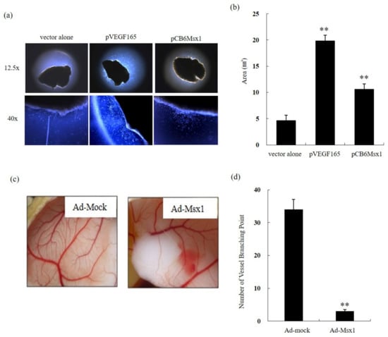 Msx1 inhibits vessel sprouting ex vivo and in vivo angiogenesis. (a) Cross-sections of a mouse tibialis anterior muscle injected with pVEGF165 or pCB6 Msx1 plasmid by electroporation were embedded in growth factor-reduced Matrigel. An outgrowth of capillary-like structures was observed with an inverted microscope. (b) The outgrowth was quantitated by measuring the area of capillary-like structures. (c) Ad-Msx1 inhibits angiogenesis in vivo. Ten-day-old chicken chorioallantoic membranes (CAMs) were treated with lysates obtained from cells infected with either Ad-β-gal or Ad-Msx1 virus. After 72 h, CAMs were harvested, and vascular density was assessed by microscopy. (d) Angiogenesis was quantitated by counting the number of branch points arising from the pre-existing vessels. Results were from three independent experiments. ** p < 0.01 indicates a significant difference.