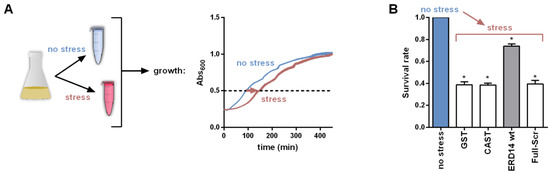 Protection of E. coli cells against stress by Early Response to Dehydration (ERD14). (A) Scheme of the cell viability assay. After a standard induction period, cells are stressed by a heat shock of 50 °C × 15 min. Viability of stressed and non-stressed samples were compared based on their cell growth after appropriate dilution into fresh medium. (B) Survival rate (viability) is reduced to about 39% (compared to non-stressed cells) in the case of overexpression of control proteins (glutathione S-transferase (GST) and intrinsically disordered proteins (IDP) Calpastatin (CAST)), whereas the overexpression of ERD14 increases the survival rate to about 73.9% after stress, which is a highly significant difference. Keeping the amino acid composition but scrambling the sequence of ERD14 (Full-Scr ERD14) completely abolishes its protective effect. Survival rates are shown as mean values with SEM, significant differences are labeled with asterisks (*).