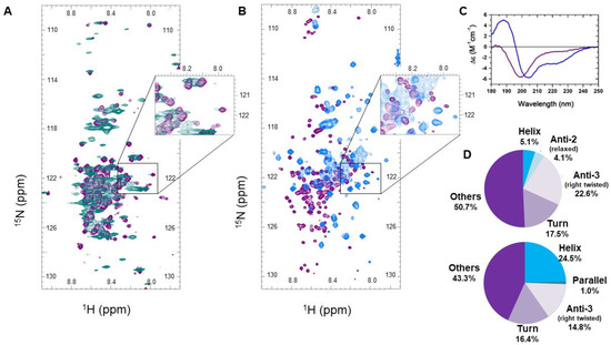 Changes in the in-cell NMR spectrum of ERD14 correspond to intracellular interactions (A) In-cell 1H-15N HSQC spectrum of scrambled (Full-Scr) ERD14 (teal) is compared to the HSQC spectrum (purple) of purified Full-Scr ERD14 recorded in buffer. Broadenings of several resonances can be observed, but there is no peak disappearance in the region observed for WT ERD14 (insert, cf. also Figure 2A). For easier comparison, the zoomed region is the same as in case of WT ERD14; however, because of the scrambling, the exact sequences are not the same in the two proteins. An assignment of Full-Scr can be found in Supplementary Figure S1C (Supplementary Materials). (B) Comparison of the 1H-15N HSQC spectra of WT ERD14 measured in MES buffer (pH 6.5) (purple) and in the presence of 30% trifluoro-ethanol (TFE) (blue). As shown by circular dichroism (C,D) measurements (C), TFE at this concentration induces conformational changes in ERD14, yet it only causes peak shifts and broadening, no signal disappearances (Panel (B), insert). (D) Analysis of circular dichroism (CD) spectra by BeStSel [59] suggests that WT ERD14 is mostly disordered (a-helix content 5%), whereas in the presence of 30% TFE, it assumes a significant secondary structure (α-helix content is 24%).