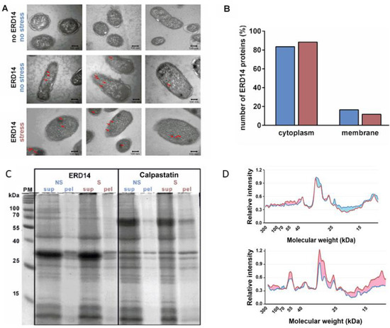 ERD14 protects the proteome of the cells. (A) ERD14 is primarily localized in the cytoplasm and does not translocate to the cell membrane upon stress, as shown by electron microscopy (EM). FLAG-tagged ERD14 was overexpressed in E. coli cells, which were fixed by formaldehyde either before (second line) or after (third line) heat stress (50 °C × 15 min). Slices of fixed cells were immunostained by anti-FLAG primary and nanogold-conjugated secondary antibody. Red arrows show gold particles corresponding to ERD14 protein, indicating a primarily cytoplasmic localization both before and after stress. No staining is seen in cells in which ERD14 was not overexpressed (first line). (B) Analysis of 100 gold particles show that 84% and 88% of the observed particles are localized in the cytoplasm before (blue) and after (purple) heat stress, respectively, whereas the low percentage of particles localized next to the membrane does not increase upon stress. (C) ERD14 protein has a general protective effect on the proteome, as shown by the pattern of proteins in solution (supernatant, sup) and pellet (pel) on 12.5% SDS-PAGE gels in cell extracts of cells overexpressing ERD14 or calpastatin, before (no stress, NS) and after (stress, S) heat stress. (D) Densitometric analysis of pellets before (blue line) and after (red line) stress was carried out using ImageJ image processing software. Differences are colored for better clarity. The results suggest that after heat stress, proteins within the whole Mw range get more aggregated in the presence of calpastatin but remain more in solution in the presence of ERD14 (the observed differences are significant).
