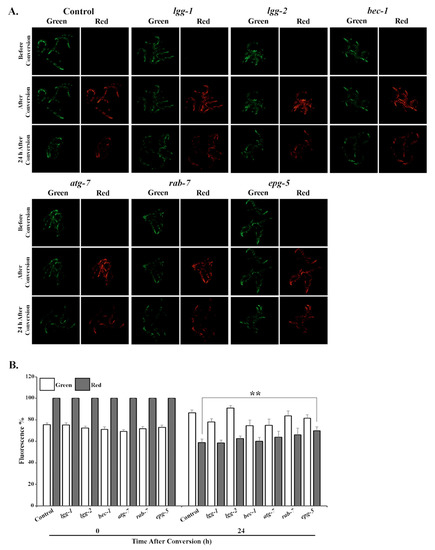 Long-lived misfolded proteins and defective cellular organelles are in turn degraded by the ALP. There are three main types of autophagy reviewed in [6], including macroautophagy, hereafter referred to as autophagy. The initiation of autophagy starts by the formation of an isolation membrane, the phagophore, which elongates to engulf the substrate(s), thus forming the double-layered autophagosome. This then fuses with late endosomes and lysosomes, leading to the formation of autolysosomes, where the substrate(s) is degraded by lysosomal hydrolases [2,7,8]. Autophagy is mediated through the conserved action of several proteins, from yeast to mammalian cells. A class-III phosphatidylinositol 3-kinase (PI3K) complex, together with lipid kinase VPS34 and the regulatory protein Beclin1, initiate the autophagic process by mediating vesicle nucleation. Two ubiquitin-like conjugation systems, encoded by the autophagy-related genes (atg), then regulate the elongation of the isolation membrane. The first conjugation system comprises ATG-12 and ATG-5, conjugated via a covalent bond mediated by the E1-like ATG-7 and E2-like ATG-10. The second conjugation system involves ATG-8, which conjugates with lipid phosphatidylethanolamine in a process regulated by ATG-7 and the E3-like ATG-3. The ATG-5-ATG-12 conjugate is detached after autophagosome formation, whereas ATG-8 remains in the autophagosome in its conjugated form. Currently, yeast ATG-8 and its mammalian homolog LC3 are the most commonly used markers for autophagic activity [9,10,11,12]. Another set of proteins functions at the last fusion step. RAB-7, a member of the Rab GTPase family, is present in late endosomes, and is involved in regulating the fusion to late lysosomes [12]. Additionally, mEPG-5 is required for the maturation of autophagosomes and their fusion to lysosomes [13,14]. The activation of autophagy can be induced by several stimuli, such as amino-acid deprivation, starvation or various stress conditions [15,16].