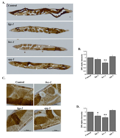 3.5. RNAi of lgg-2 or bec-1 Causes Distinct Responses in Proteasome Tissue Expression