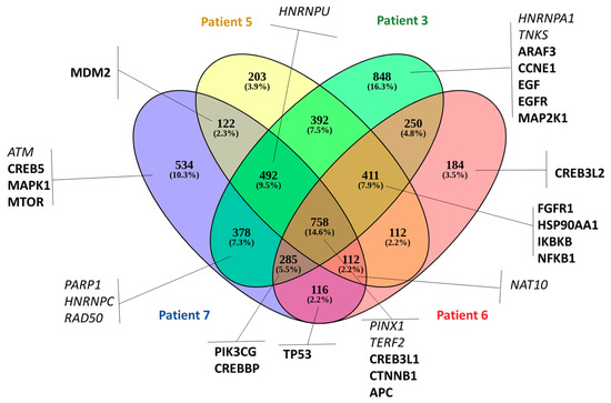 Next, we evaluated the SNVs and indels in coding regions to highlight the presence of clinically relevant mutations. Patients 3, 5, 6, and 7 presented the highest number of genes among all patients, with genetic variation in coding regions (frameshift indels and/or missense SNVs). In Figure 5, we used a Venn diagram to illustrate the CTC-shared SNVs and indels between those four prostate cancer patients. We combined all genetic variation found in different CTCs isolated from the same patient. Patients 3, 5, 6, and 7 shared 758 genetic variations. To further understand the potential biological functions of CTC-shared SNVs and indels, we performed KEGG pathway (http://www.kegg.jp/) and GO (http://www.geneontology.org/) biological process analyses. In the total affected genes (4698), nine are associated with telomere maintenance (Gene Ontology term, GO:0000723) (ATM, PARP1, HNRNPC, RAD50, PINX1, TERF2, NAT10, HNRNPA1, and TNKS) (9 of 36 genes found in this pathway) and 18 genes were related to prostate cancer in the KEGG database (hsa05215) (18/89 found associated with prostate cancer) (Figure 5 in bold). In Supplementary Materials Figure S2, we illustrate the CTC-shared SNVs and indels results found for each patient and important genes affected.
