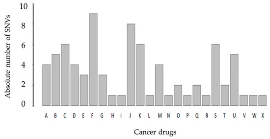 Bar plot of SNVs associated with known cancer drugs in the PharmGKB database. The PharmGKB database gathers all currently reported variant–drug interactions by at least two different scientific publications. The x-axis illustrates the cancer drugs, anthracyclines (A), capecitabine (B), carboplatin (C), cisplatin (D), cyclophosphamide (E), docetaxel (F), doxorubicin (G), doxorubicinol (H), exemestane (I), fluorouracil (J), gemcitabine (K), imatinib (L), irinotecan (M), letrozole (N), leucovorin (O), lonafarnib (P), methotrexate (Q), oxaliplatin (R), paclitaxel (S), platin compounds (T), thalidomide (U), tipiracil HCL (V), trastuzumab (W), and trifluridine (X). The y-axis is the number of SNVs found associated with each drug. The same SNV can affect the response of different drugs.
